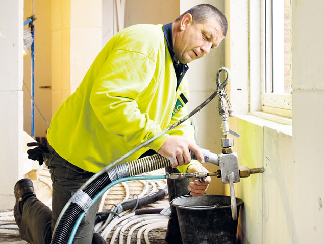Een aannemer van vijf nieuwbouwwoningen in Gemert laat de spouwmuren van binnenuit vullen met parels van polystyreen. Het gaat sneller en is goedkoper dan het aanbrengen van isolatie tijdens het metselen.