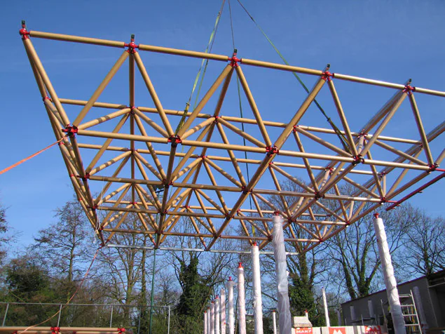 Het dak van de uitbreiding van het clubhuis van hockeyvereniging Ring Pass in Delft rust op een vakwerk van kartonnen buizen.