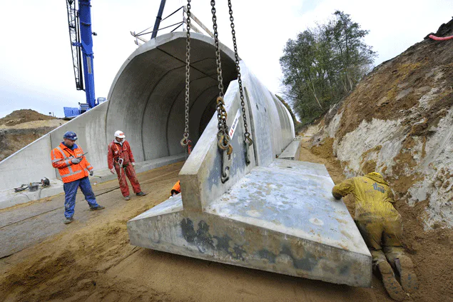 Samen met transportbedrijf Teuben uit Oosterhout plaatst Martens Prefab Beton uit Waalwijk de elementen voor een tunnel bij Eys in Zuid-Limburg.