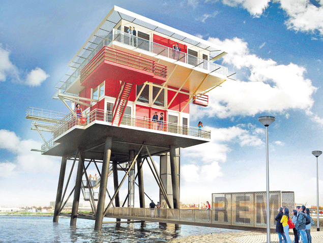 Het stalen casco van het REM-eiland staat in een constructiehal van aannemingsbedrijf Heuvelman Ibis in Delfzijl. De afdeling staalbouw gaat het gevaarte ontroesten, verbouwen en optoppen.