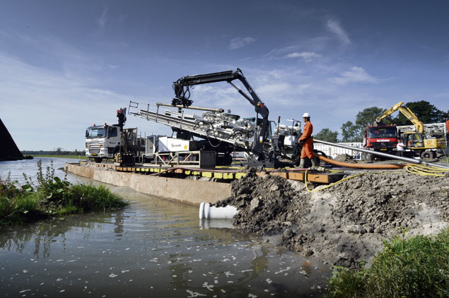 Dura Vermeer Ondergrondse Infra uit Hoofddorp brengt vier buizen van hdpe (high density polyethyleen) aan onder de Leidsche Rijn bij Utrecht.