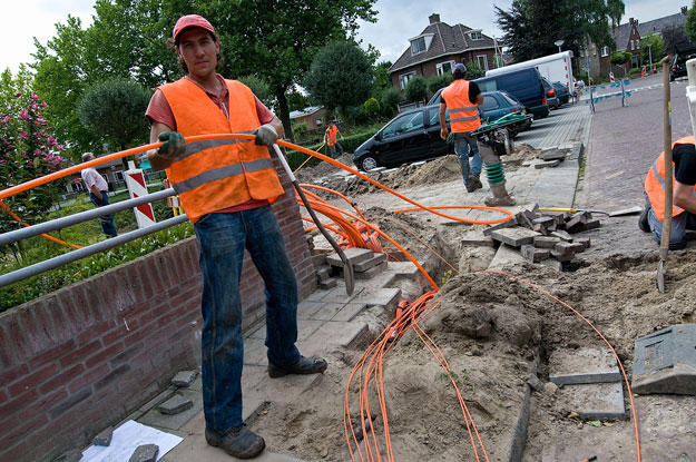 Schuuring uit Harderwijk legt een turnkey glasvezelnetwerk voor consumenten aan in de gemeente Almere. Hoewel glasvezel een moderne technologie is, gaat het leggen van de kabels grotendeels op traditionele wijze.
