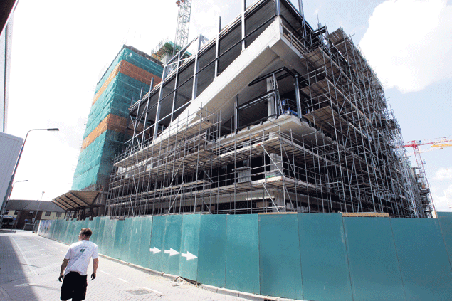 Een stalen spant van de bioscoop in het complex Rustenburg in Zaandam is meer dan verwacht doorgebogen, nadat het donderdag werd belast met betonnen dakelementen.