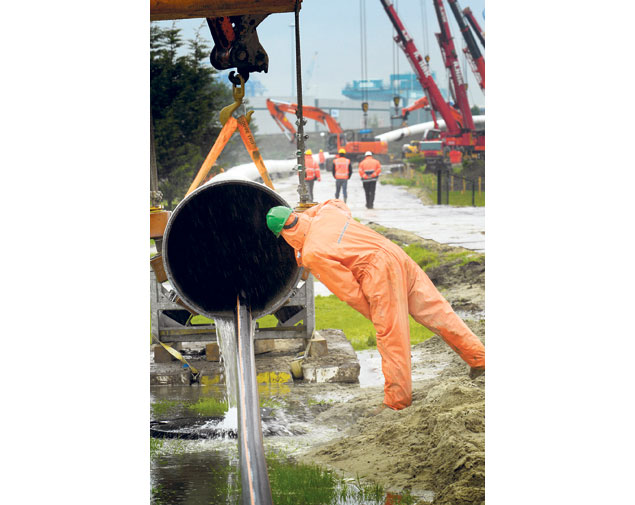 Aannemingsbedrijf Dura Vermeer Ondergrondse Infra uit Hoofddorp verlegt een watertransportleiding langs de Betuweroute.