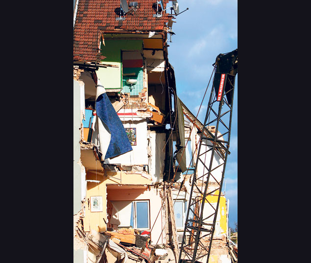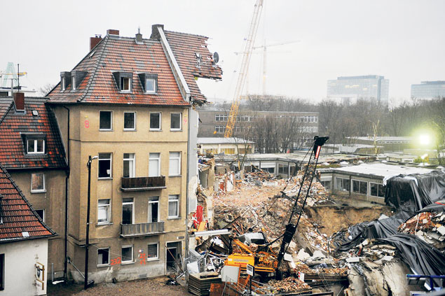 - Rommelende geluiden gingen vooraf aan het instorten van een kantoorgebouw in Keulen. Dat suggereert beweging van de ondergrond, waarop het gebouw was gefundeerd. Daar hadden de constructeurs uit de jaren zeventig kennelijk niet op gerekend, want de stapelbouw bezweek volledig.
