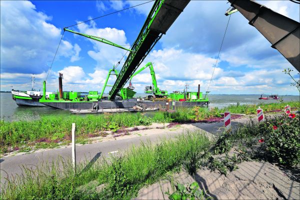 De Vries & Van de Wiel uit Schagen lost op hoogzand voor Middenduin, een uitbreiding van Almere langs de IJmeerdijk. "Gebaggerd uit het IJsselmeer, uit de vaarweg tussen Amsterdam en Lemmer", licht directeur Jan-Mark van Mastwijk toe.