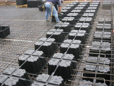 De Italiaanse Daliform Group produceert holle polypropyleen bakken op pootjes die ingestort worden in vloeren en op die manier zorgen voor een besparing op beton. U-boot Beton biedt het systeem aan op breedplaatvloerelementen.