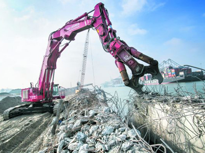Van Leeuwen Katwijk Sloopwerken heeft een standaard Hitachi-sloopmachine omgebouwd tot 'rode duivel' met drie masten, een schaar van 18 ton en een tot 8 bij 8 meter verlengd en verbreed rijwerk.