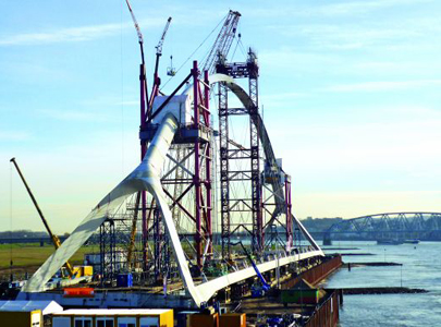 De uitvoering van stadsbrug 'De Oversteek' in Nijmegen heeft tot allerlei onderzoeken geleid, zoals de beproeving van casingpalen, het omhoogstorten van beton op een helling, constructief vullen met schuimbeton en de ontwikkeling van een machine voor het boucharderen van beton.