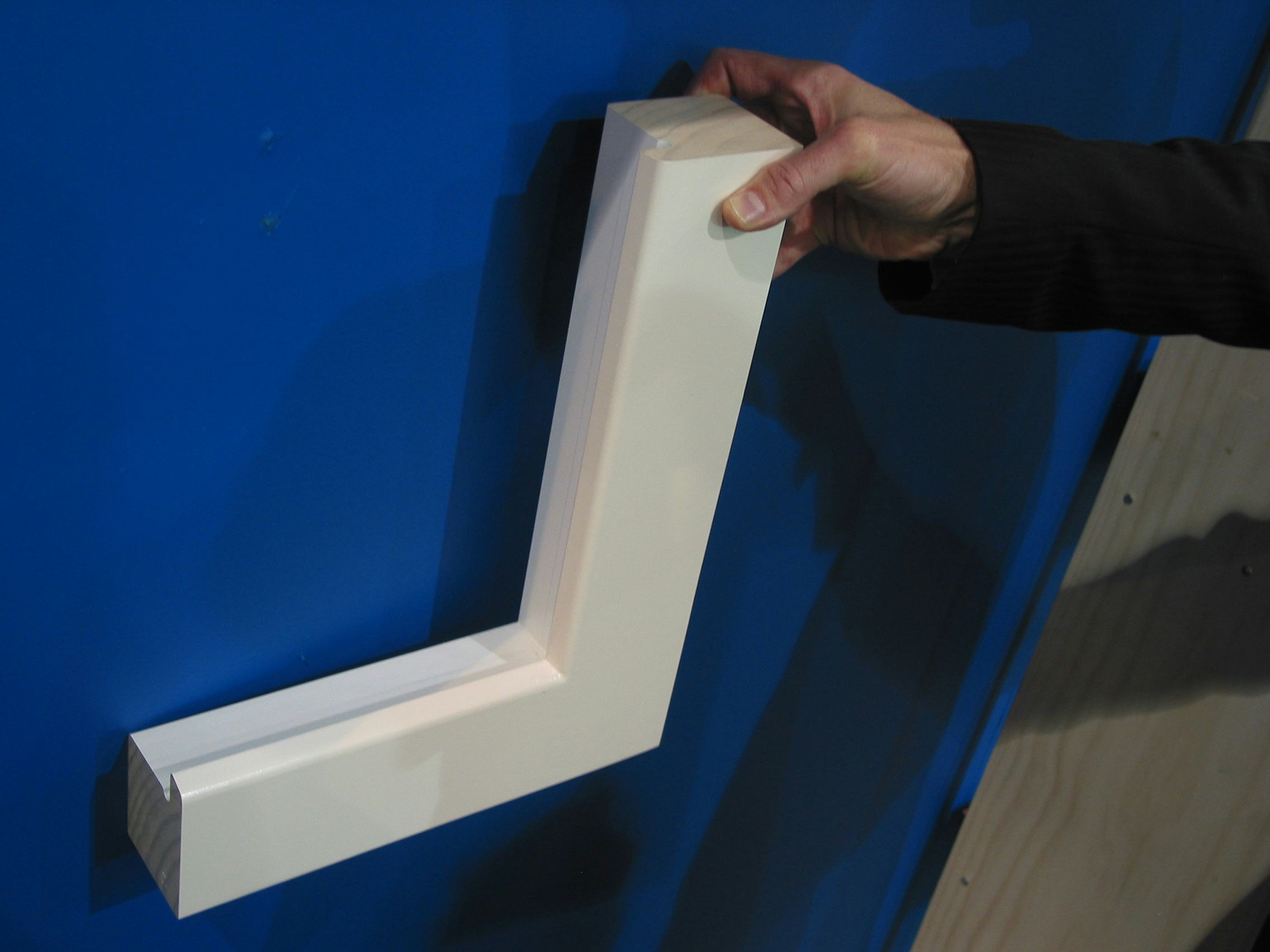 TimmerSelekt Doornenbal uit Veenendaal showt op de Bouwbeurs een houten raam zonder bilnaden of visbekken in de hoeken.