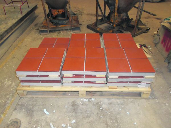 Westo Prefab Beton Systemen produceert betonplaten met een bekleding van rode keramische tegels. Ze zijn bestemd voor de bestrating van het terras bij de ingang van het Museon in Den Haag.