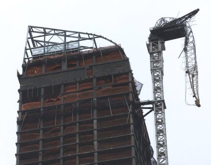 De storm Sandy heeft in Manhattan een kraan vernield bij een 90 verdiepingen hoog appartementengebouw.