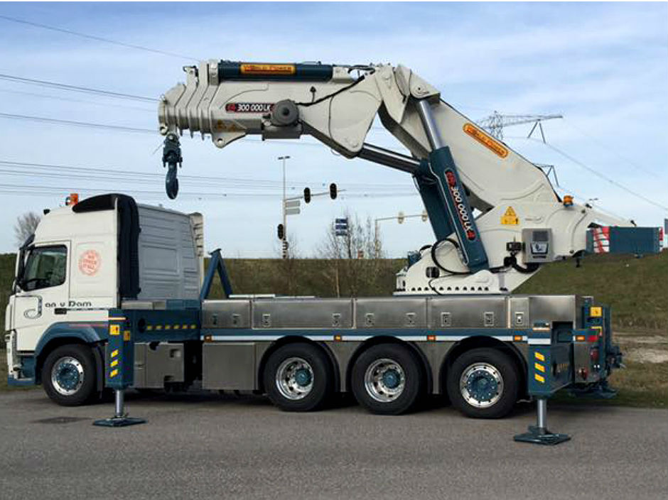 De Erkin ER300.000LK4 heeft een kraanmoment van maar liefst 300 tonmeter. De hydraulische lengte is 10,6 meter en in rijstand is dat 3,5 meter. In totaal weegt de Volvo inclusief de kraan zonder ballast 31.260 kilo. Maximaal komt daar 12 ton aan ballast bij. Jan van Dam Machinetransport zet de nieuwe Volvo met de Erkinkraan