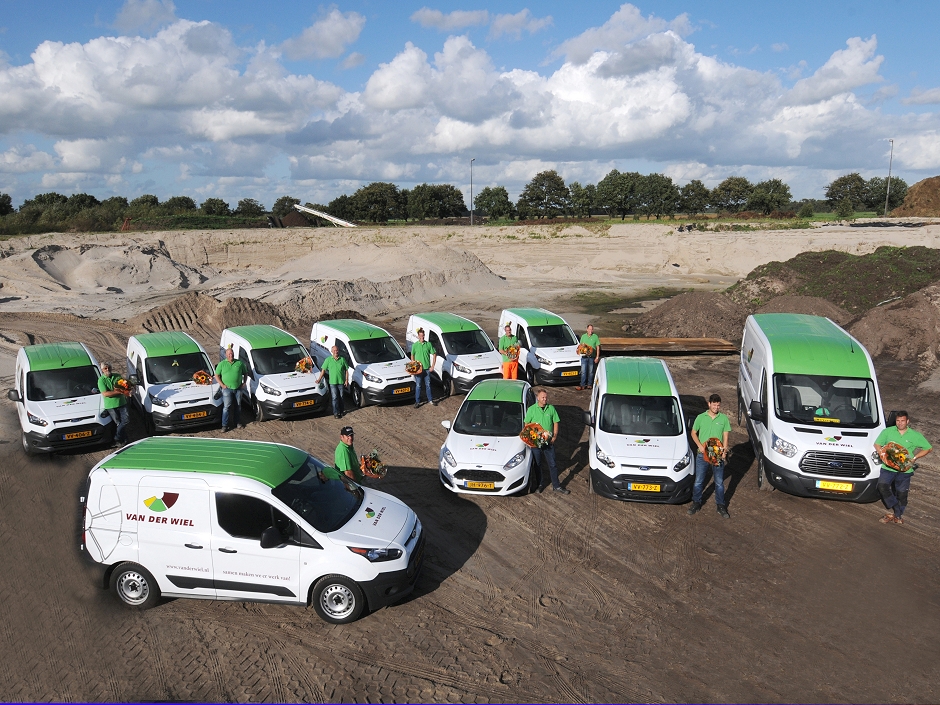 De bekende roodbruine achtergrondkleur op de Van der Wiel voertuigen maakte plaats voor helder wit. Wat bleef is het levendig groene dak dat nu een echte eyecatcher is geworden. Verder werd het bekende logo gestyleerd en groot maar subtiel op de zijkanten geplaatst, met daarnaast een versie in kleur en de naam van het bedrijf.