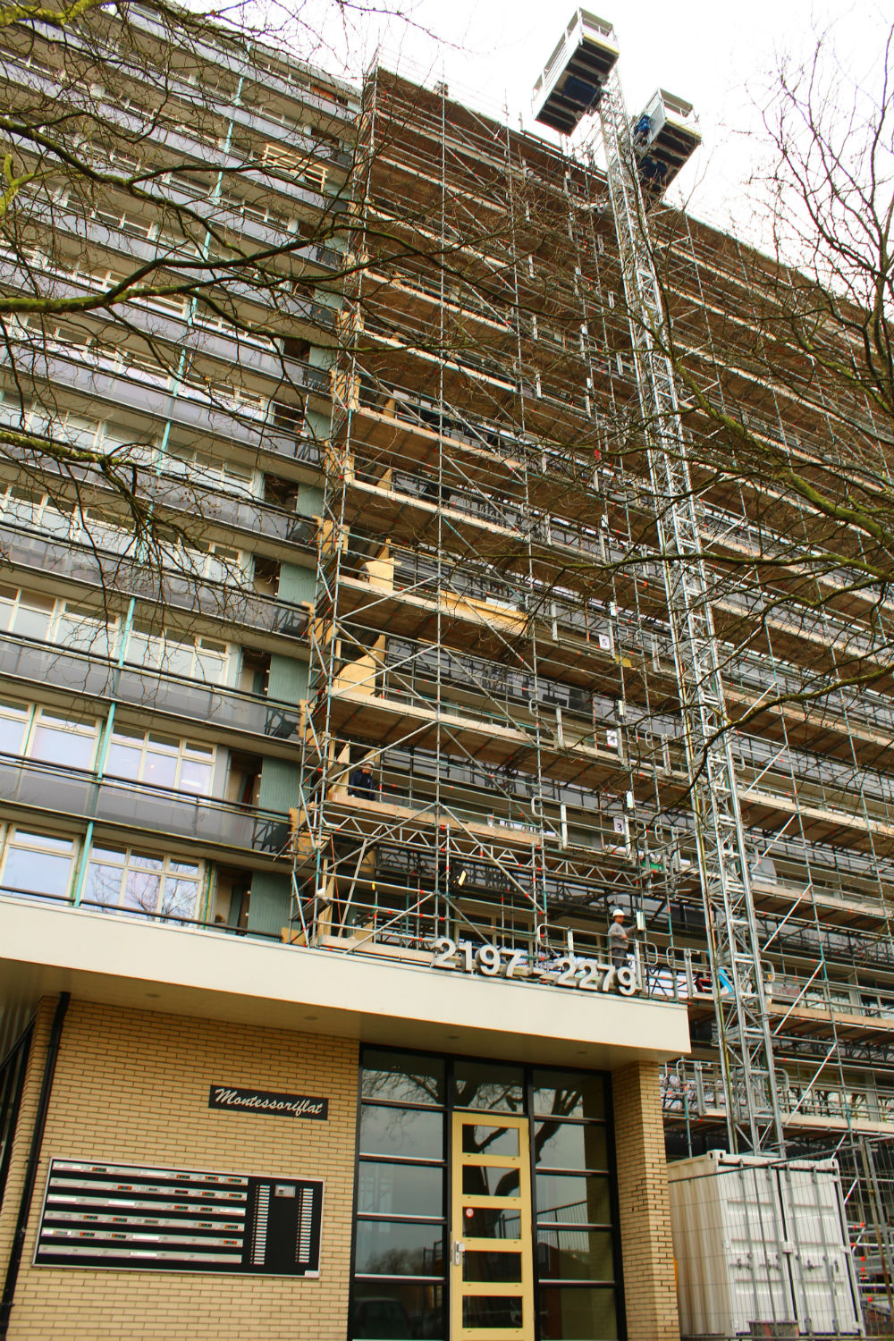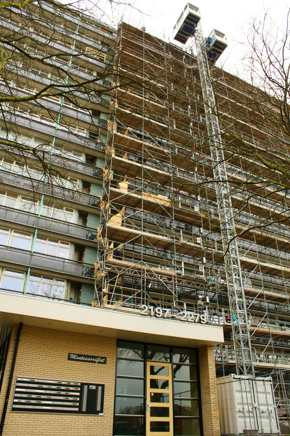 Corporatie Seyster Veste wil niet dat aannemer Van Dillen het verticale bouwtransport voor de renovatie van de Montessoriflat in Zeist binnendoor afwikkelt. Mensen en materialen gaan daarom langs de buitengevel.