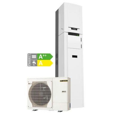 Remeha biedt twee hybride lucht/water-warmtepompsystemen. De ene komt met een bijbehorende cv-ketel; de andere wordt gecombineerd met een bestaande cv-ketel.