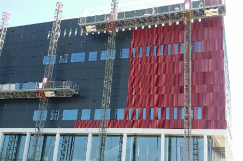 Ruim 18.000 gekleurde aluminium kokers sieren de gevel van CineMec Leidsche Rijn. De buitenste gevelafwerking van de bioscoop, een project van hoofdaannemer Dura Vermeer Hengelo, is nu voor ongeveer een derde gereed.