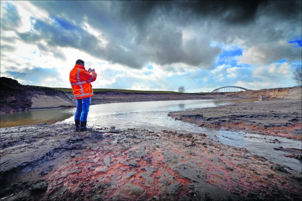 Ook een manier om als uitvoerder in de krant te komen: als conculega van de fotografen die zich elke dag inspannen om de extra grote plaat te leveren. Hier is uitvoerder Berry van Oostrum van Combinatie Martens en Van Oord-Heijmans bezig foto's te maken van de 4,5 meter diepe oevergeulen die zijn gegraven in de uiterwaarden om de Lek meer ruimte te geven.