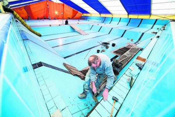 Een kleine 2000 vierkante meter aan azuurblauwe Buchtaltegels zet Rietmeijer uit Almelo op het vernieuwde buitenbad van zwembad De Kerkvlekken in Havelte.
