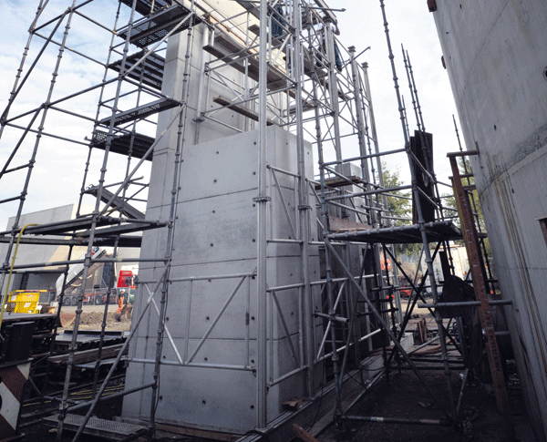 In Lexmond halen steigerbouwers de bekisting weg van het trappenhuis voor een nieuwe door Visser Smit Bouw gebouwde reinwaterkelder.
