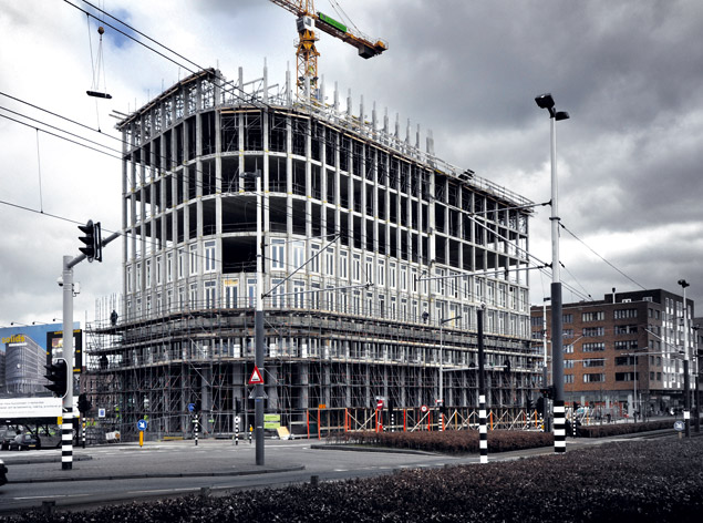 Op IJburg werkt een veilig aangelijnde medewerker van bouwcombinatie JP van Eesteren - Era Contour op grote hoogte aan het eerste bestemmingsvrije gebouw van Nederland, Solid.