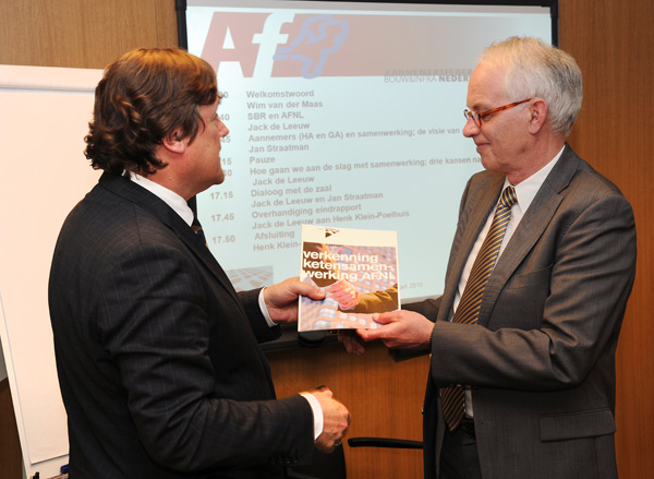 Jack de Leeuw (directeur SBR) overhandigde maandag 29 maart het rapport Ketensamenwerking AFNL aan Henk Klein Poelhuis (voorzitter Aannemersfederatie Nederland Bouw & Infra).