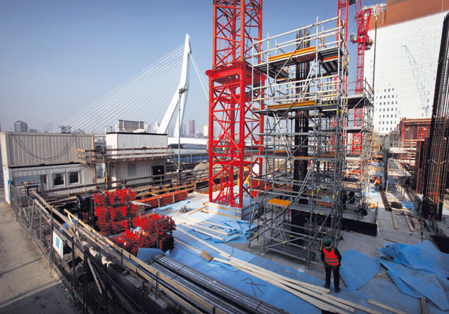 RotterdamMedewerkers van hoofdaannemer Züblin Nederland zijn bezig met de voorbereiding van het storten van de eerste bovengrondse kolom van de woontoren van De Rotterdam. De twee ondergrondse parkeerlagen zijn inmiddels gereed. De Rotterdam, 149 meter hoog, moet straks een gezichtsbepalend gebouw worden op de Wilhelminapier, vlak naast de Erasmusbrug, de cruiseterminal en een aantal hoge