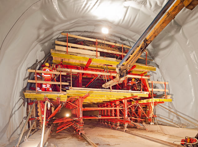 Aannemer Alpine BeMo Tunnelling werkt aan de wanden van een van de 31 verbindings- en evacuatietunnels tussen de oude en de nieuwe buis van de Oostenrijkse Pfändertunnel in Bregenz.