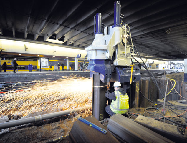 Een lasser van funderingsbedrijf Gebr. van 't Hek werkt aan een negen meter diepe damwand op een van de perrons op het Centraal Station in Utrecht.