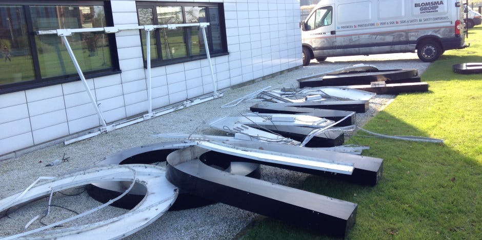 Bouwend Nederland resideert niet langer in het Bouwhuis. De letters zijn donderdag van de gevel gehaald.