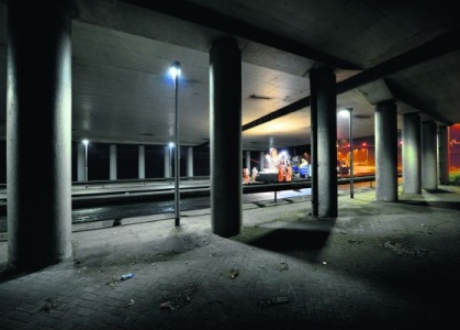 Medewerkers van KWS Infra wachten zondagochtend om half vier op de aanvoer van nieuw asfalt voor het verkeersplein Laagraven in Utrecht. Ondanks de nachtelijke uren was het warm onder het viaduct van de A12; door de windstilte bleef het nabij de 20 graden.
