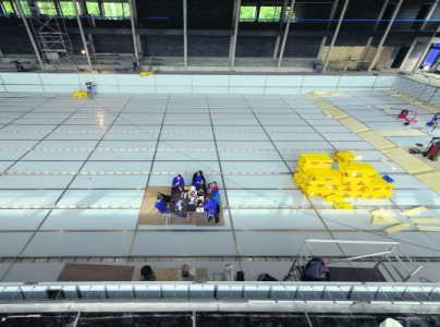 Medewerkers van staalbouwer Veenbrink lunchen op de bodem van het nieuwe Krommerijn-zwembad in Utrecht.