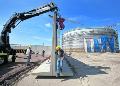 Werknemers van Bosch Beton plaatsen betonelementen voor een nieuwe opslagbak of sleufsilo op het terrein van Suiker Unie in het Groningse Hoogkerk. In totaal komen er acht open silo's van 110 meter lengte en 27 meter breedte voor de opslag van perspulp.