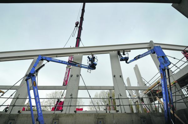 Medewerkers van GS Staalwerken monteren een stalen spant op prefab betonkolommen voor de nieuwbouw van bad nummer twee van het nieuwe multifunctionele zwemcomplex Groenhovenpark in Gouda.