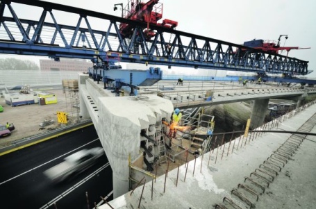 Op de Amsterdamse Westrandweg worden door werknemers van Van Hattem en Blankevoort voorbereidingen getroffen voor het storten en afspannen van een nieuw deel van het brugdek.