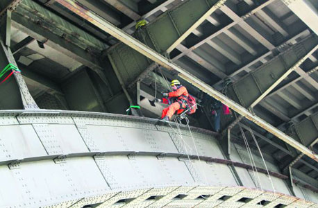 Werknemers van het Arnhemse bedrijf Orange Access werken onder de Waalbrug bij Nijmegen aan het vervangen van elektriciteitsbekabeling van de verlichting op de brug.