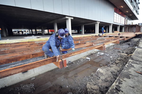 Het ziet eruit als een houten steiger, maar het is eigenlijk een combinatie van beton, staal en houtbouw. Gww-bedrijf Cor Nab bouwt in Almere aan een constructie die dienst zal doen als toegangsroute tot wonen en winkels, wandelroute en bootsteiger. "Ik heb heel wat steigers gebouwd, maar nooit zoiets als dit."