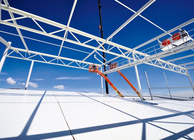 Nu nog onder een strak blauwe hemel bouwen werknemers van De Kok Staalbouw en Breda Bouw aan de dakconstructie op de helling van een nieuwe indoor skihal op het terrein van Sneeuwattractiepark Skidôme in Rucphen.