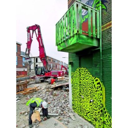 Onder de waakzame blik van een graffiti-jaguar worden in de Reitzstraat in de Haagse Transvaalbuurt oude woningen gesloopt om ruimte te scheppen voor nieuwe.