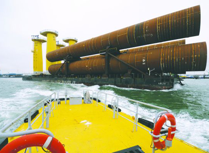 Vanuit de haven van Vlissingen zet een transport met funderingspalen voor windmolenpark DanTysk koers naar de kust op de grens van Duitsland en Denemarken.