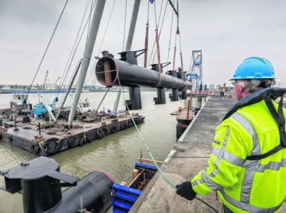 In de Heijsehaven op het voormalig RDM-terrein in Rotterdam brengt een drijvende bok de laatste van zes secties van een nieuw remmingwerk op zijn plaats.