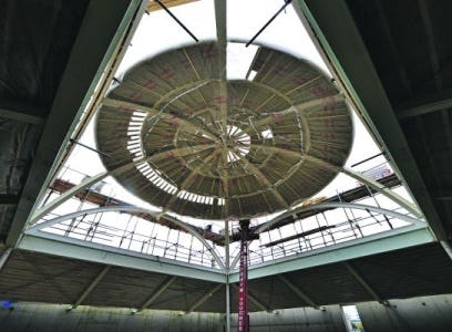 In de Utrechtste wijk Lombok zaagt een medewerker van Abeco isolatie op maat voor de koepel van de Ulu Moskee. Het door Isha Önen uit Zaandam ontworpen complex vervangt de huidige moskee tegenover de bouwplaats in een voormalig badhuis.