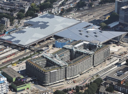 Twee grootse gebouwen die de dynamiek van Rotterdam verbeelden komen bijeen op het Stationsplein. Op de voorgrond het Groothandelsgebouw uit 1953, icoon van de Wederopbouw, erachter het Centraal Station waaraan sinds 2004 wordt gewerkt en dat in de loop van 2013 zal zijn voltooid.