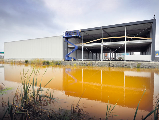 Werknemers van Dijkham Bouw uit Nijkerk plaatsen op het bedrijventerrein Lorentz in Harderwijk de daklijst van een nieuwe bedrijfshal voor Smink Groenten en Fruit.