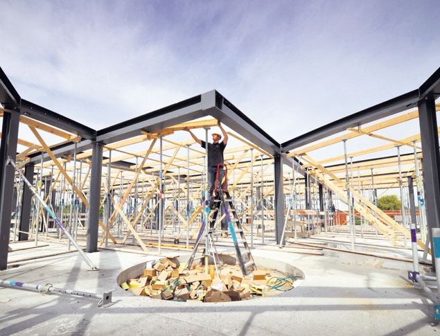 Met aan zijn voeten de verpakkingsresten van de ankers van de staalconstructie, stelt een medewerker van bouwbedrijf De Vries en Verburg uit Stolwijk in Delft de onderslagen voor de vloer van de gymzaal van de brede school De Harnaschpolder.