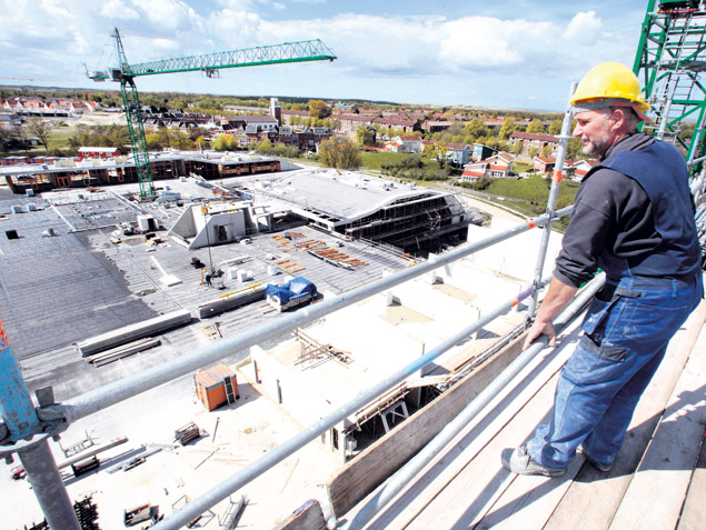 Een steigerbouwer kijkt uit over de vorderingen van het Centrumplan in Den Helder.