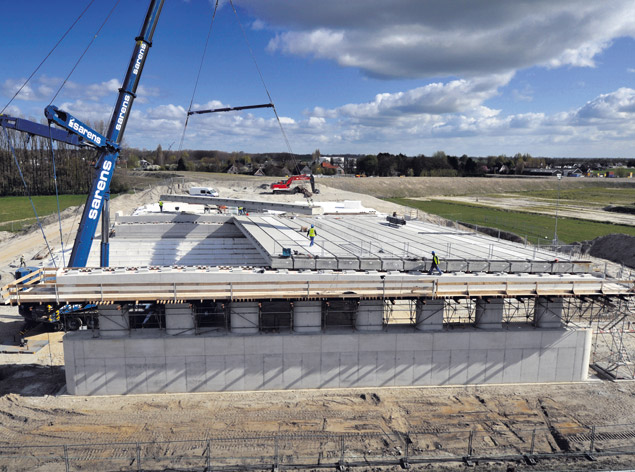 Een kraan van Sarens brengt bij Alphen aan den Rijn de eerste betonliggers voor het viaduct over de spoorlijn Bodegraven-Leiden op hun plaats.