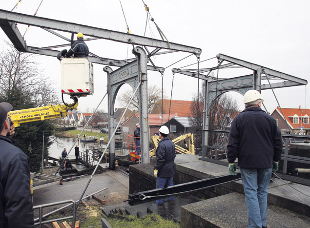 De basculebrug uit 1908 in Strijensas wordt gedemonteerd voor reconstructie in de werkplaats van Aannemingsbedrijf Hofman Sliedrecht.