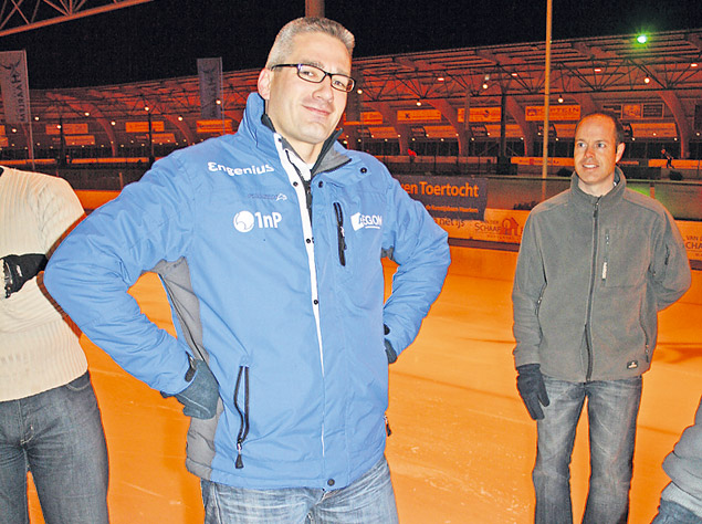 Schaatser Arjen van der Kieft, een 19-jarige student werktuigbouwkunde, vertegenwoordigt dinsdag bij de Olympische Spelen Nederland op de 10.000 meter. Peter Everaardt, commercieel manager van detacheringsbureau voor ingenieurs Engenius, staat langs de lijn om hem aan te moedigen. Engenius sponsort Van der Kieft.