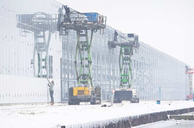 In het besneeuwde landschap van Wateringen plaatsen onderaannemers van Technokas uit De Lier geïsoleerde panelen op de voorgevel van een orchideeënkas met verdieping bij de firma Ter Laak.